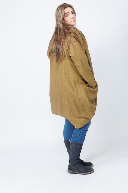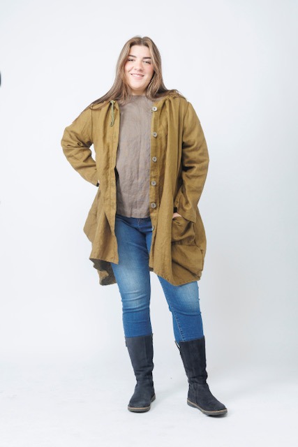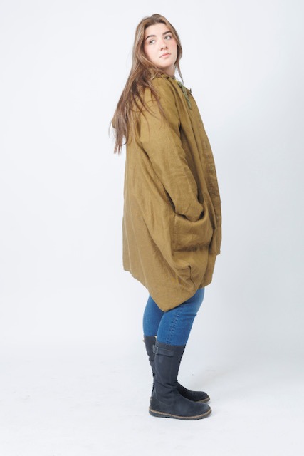 Women’s linen generous fitting coat with adjustable neck, hood, pockets, and interesting hem.