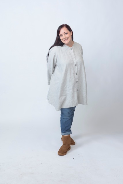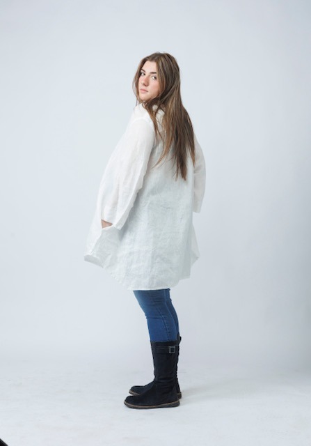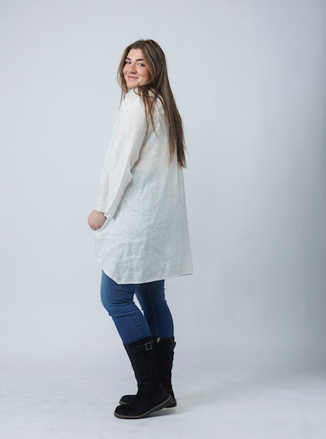 Women’s linen collarless button-up shirt with handkerchief hem and pockets.